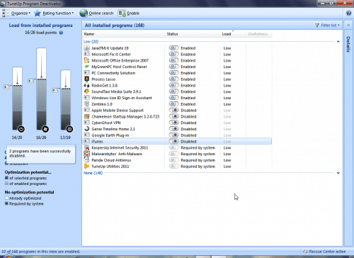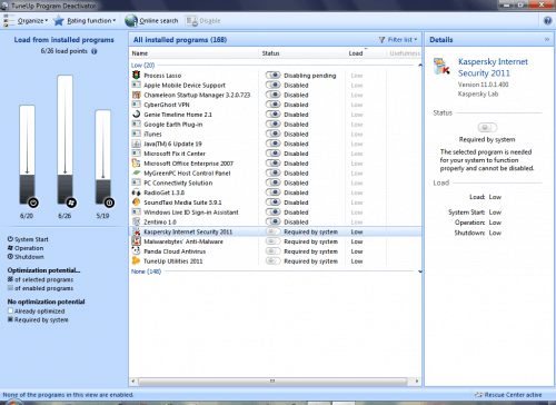 TuneUp Utilities 2011 ships with a range of new features that is designed to help you keep your PC optimized to its core. The most unique of the features is the TuneUp Program Deactivatorthat lets you switch-off installed applications, without you having to remove any of them from your computer. It can disable rarely used programs with just a click by removing startup entries of the program, turns off their services, stops their scheduled tasks, etc which is slowing down the computer, while leaving the program files, your data, and everything else intact.